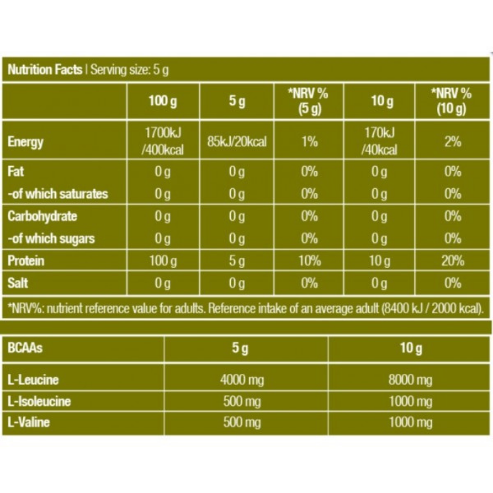 BCAA-të i përkasin 9 aminoacideve thelbësore për trupin e njeriut, që do të thotë se trupi juaj nuk është i aftë t’i prodhojë vetë dhe ka nevojë për ushqim ose suplemente për të marrë këto lëndë ushqyese shumë të rëndësishme. BCAA 8:1:1 e BioTechUSA përmban një sasi të shtuar të leucinës, aminoacidi i parë ndërtues i proteinave që përdoret nga trupi juaj.