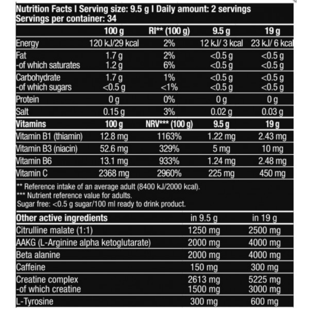 Portokalli i kuq: Kompleksi NOX i Gjakut të Zi 55.5% [L-Argininealpha ketoglutarat, Beta Alanine, Citruline malate (L-Citruline, acid malik)], Kompleksi i Kreatinës 27.5% [kreatinë monohidrat i mikronizuar, citrat kreatine (kreatinë monohidrat i mikronizuar, kripëra kalciumi të acidit citrik), kreatinë monohidrat i tamponuar (kreatinë monohidrat i mikronizuar, oksid magnezi)], trashës (gomë ksantani), L-Tirozinë, agjentë kundër ngjitjes (kripëra magnezi të acideve yndyrore, dioksid silikoni), acid L-askorbik, aromatizues, kafeinë 1.57%, ëmbëlsues (acesulfam K, sukralozë), ngjyrues (Allura Red AC, tartrazinë)[1], Kompleksi i Vitaminës B (acid nikotinik, mononitrat tiamine, piridoksinë hidroklorur).
