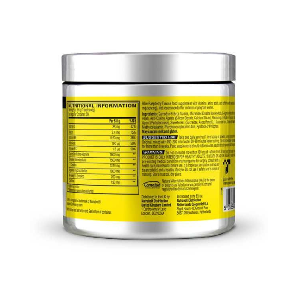 Përbërësit: CarnoSyn Beta-Alaninë, Kreatinë Monohidrat i Mikronizuar, Argininë Alfa-Ketoglutarat, Rregullues Aciditeti (Acid Citrik), Agjentë Anti-Grumbullim (Dioksid Silici dhe Silikat Kalciumi), Aromatizues, N-Acetil-L-Tirozinë, Kafeinë Anhidrike, Ëmbëlsues (Acesulfam K dhe Sukralozë), Agjent Shtues (Polidekstrozë), Acid L-Askorbik (Vitaminë C), Ngjyrues (Blu e Shkëlqyer FCF), Nikotinamid (Niacinë), Piridoksal-5-Fosfat (Vitaminë B6), Acid Folik (Vitaminë B9), Metilkobalaminë (Vitaminë B12).