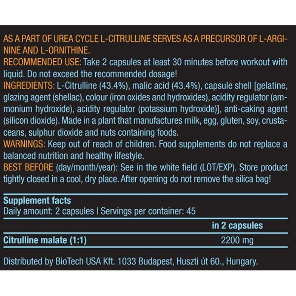Ashtu si të gjitha produktet BioTech USA, kapsula Citrulline Malate përbëhet nga përbërës të sigurt dhe të zgjedhur me kujdes.