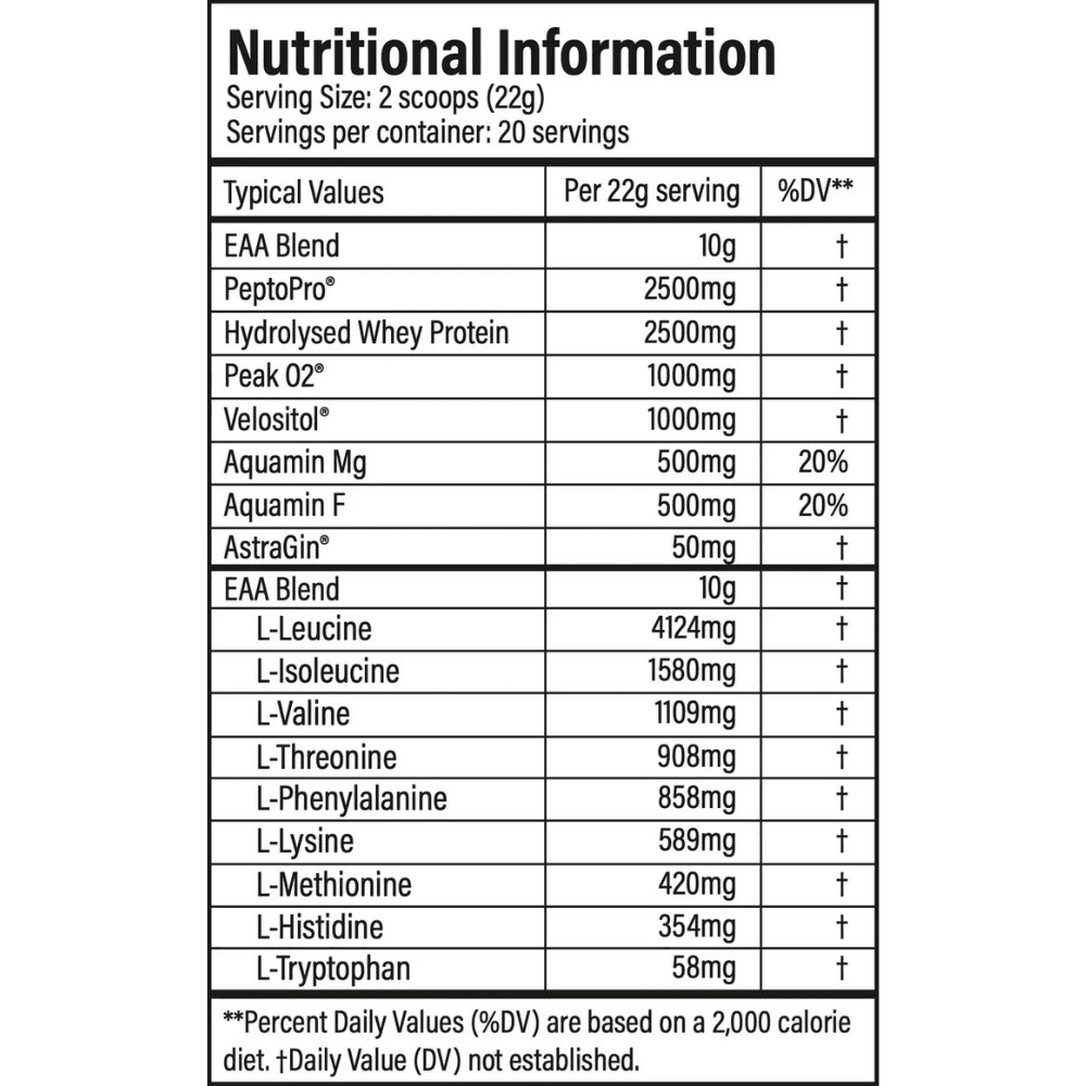 Përzierje esenciale e aminoacideve (L-Leucinë, L-Izoleucinë, L-Valinë, L-Treoninë, L-Fenilalaninë, L-Lizinë, L-Metioninë, L-Histidinë, L-Triptofan), Pepto Pro® (Kazeinë e hidrolizuar) (Qumësht), Proteinë e hidrolizuar e hirrës (Qumësht), Maltodekstrinë, Acid (Acid Citrik), Alga Detare (Aquamin MG, Aquamin F), Peak O2® (Cordyceps, Reishi, King Trumpet, Shiitake dhe Luani), Velositol® (Kompleksi i Amilopektinës së Kromit), Aromatizues, Citrat Trinatriumi, Ëmbëlsues (Sukralozë), Beta Karoten (Ngjyrues), Astragin (rrënjë Astragalus membranaceus dhe rrënjë Panax notoginseng).